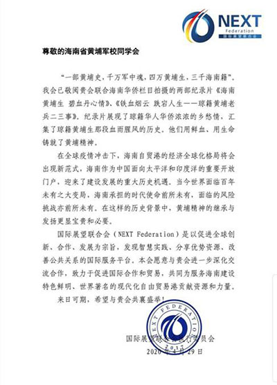 4月29日,國(guó)際展望聯(lián)合會(huì)執(zhí)行委員會(huì)致函海南省黃埔軍校同學(xué)會(huì),對(duì)海南省黃埔軍校同學(xué)會(huì)和海南華僑欄目聯(lián)合拍攝的兩部紀(jì)錄片《海南黃埔生 碧血丹心情》、《鐵血煙云 跌宕人生——瓊籍黃埔軍校同學(xué)二三事》給予充分肯定,認(rèn)為紀(jì)錄片講述了“一部黃埔史,千萬(wàn)軍中魂,四萬(wàn)黃埔生,三千海南籍”的傳奇故事,展現(xiàn)了瓊籍華人華僑濃濃的鄉(xiāng)愁情,匯集了瓊籍黃埔生那段血雨腥風(fēng)的歷史,濃縮了黃埔?guī)熒悯r血和生命鑄就的愛(ài)國(guó)革命黃埔精神。來(lái)函指出,在全球疫情沖擊下的海南自貿(mào)港建設(shè)中,繼承與發(fā)揚(yáng)黃埔精神顯得更為寶貴和必要,期盼與海南省黃埔軍校同學(xué)會(huì)進(jìn)一步深化交流合作,致力于促進(jìn)國(guó)際合作與貿(mào)易,共同為服務(wù)海南自貿(mào)港建設(shè)貢獻(xiàn)資源和力量。