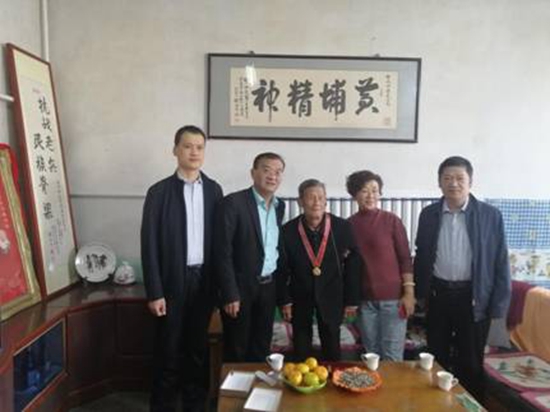 郭廣勇(左二)向山東省黃埔軍校同學會會員祁連興(中)送上紀念章。