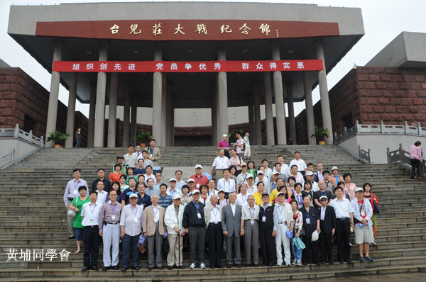 8月26日上午,海內(nèi)外黃埔校友及其后代親屬150余人冒雨參觀了位于山東省棗莊市的臺(tái)兒莊大戰(zhàn)紀(jì)念館,他們?cè)诩o(jì)念館前合影留念,并高唱黃埔軍校校歌。
