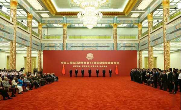 9月2日,中共中央總書記、國家主席、中央軍委主席習近平在人民大會堂,向30名抗戰(zhàn)老戰(zhàn)士老同志、抗戰(zhàn)將領、為中國抗戰(zhàn)勝利作出貢獻的國際友人或其遺屬代表頒發(fā)紀念章并發(fā)表重要講話。李克強、張德江、俞正聲、劉云山、王岐山、張高麗出席。
