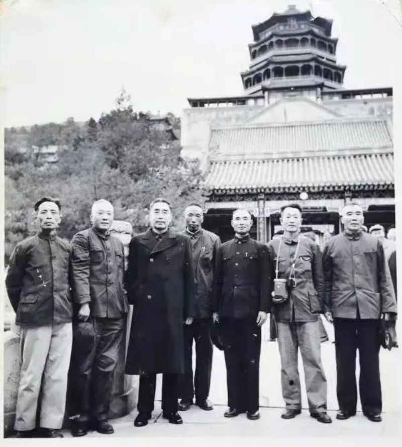 △周恩來(左三)與鄭庭笈、宋希濂、周振強、楊伯濤、杜聿明、王耀武(從左至右)在北京頤和園