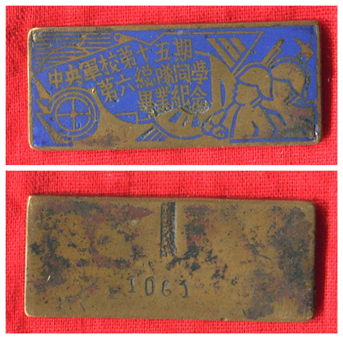 抗戰時期的黃埔軍校畢業證章多采用統一的制式,即一枚圓形的銅章,正面漆琺瑯,藍色的外圈中載明期別和總隊,中間白底襯托校旗圖案,而章的背面,多是刻有“明禮義,知廉恥,負責任,守紀律”這十二字訓詞和徽章的編號。由于各分校、總隊的畢業章是由不同的作坊制作,其外觀、材質、字體上也存在一些不同。整體來說,這種徽章樣式美觀,影響也非常深遠,不但為同一時期很多軍事院校或軍事訓練機構效仿,在黃埔軍校遷臺后也依然沿用了一段時間。因此,市面所能見者為數并不少。