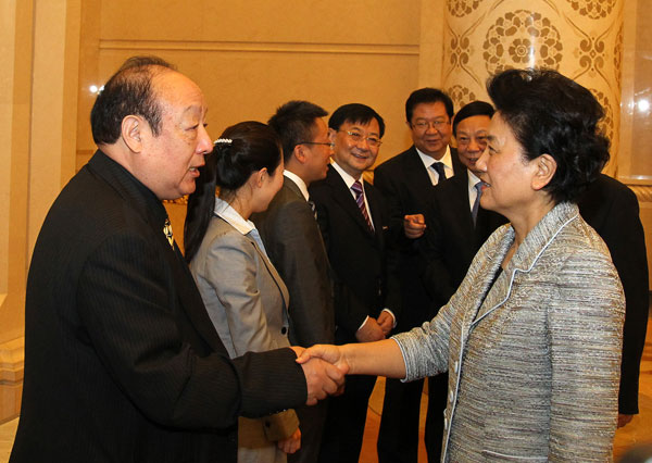 2012年9月27日劉延?xùn)|同志在北京人大會堂接見侯伯宇事跡全國巡講團成員。圖為劉延?xùn)|同志與侯伯文握手。