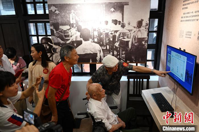 6月16日,廣州市黃埔區,黃埔軍校舊址紀念館重新開館。其中,全新策劃布展的“國共合作的不朽豐碑——大革命中的黃埔軍校(1924-1927)”校史展,通過300余張歷史圖片,以“歷史實物+多媒體還原”的形式,呈現了國共合作時期的黃埔軍校歷史,展出170件套展品,除館藏的82件套外,其余均為來自全國20個單位、黃埔后人及藏家的藏品。“黃埔同學錄查詢室”數據庫正式上線,現已收錄的黃埔軍校學員資料超過17萬人,支持以姓名、籍貫等各種方式模糊查詢。圖為百歲黃埔老人歐陽電(右二)在“黃埔同學錄查詢室”數據庫查看自己的信息。中新社記者 陳楚紅 攝