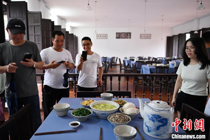 6月16日,廣州市黃埔區,黃埔軍校舊址紀念館重新開館。其中,全新策劃布展的“國共合作的不朽豐碑——大革命中的黃埔軍校(1924-1927)”校史展,通過300余張歷史圖片,以“歷史實物+多媒體還原”的形式,呈現了國共合作時期的黃埔軍校歷史,展出170件套展品,除館藏的82件套外,其余均為來自全國20個單位、黃埔后人及藏家的藏品?!包S埔同學錄查詢室”數據庫正式上線,現已收錄的黃埔軍校學員資料超過17萬人,支持以姓名、籍貫等各種方式模糊查詢。圖為黃埔軍校舊址紀念館的官長飯廳吸引參觀者。中新社記者 陳楚紅 攝