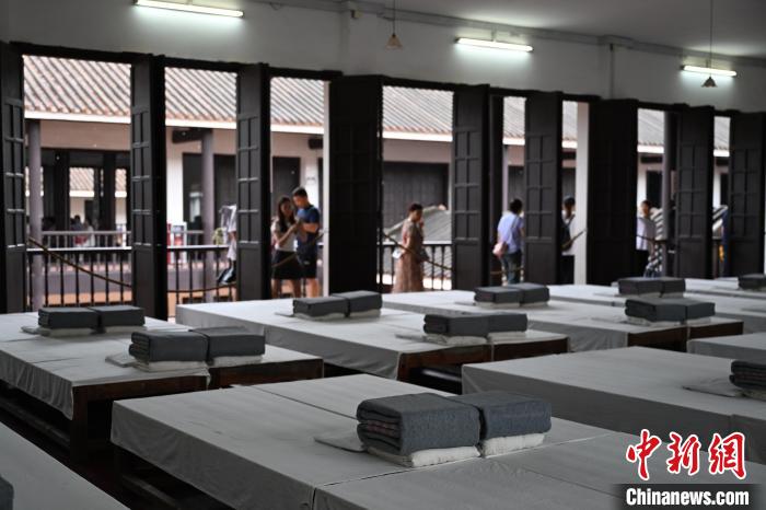 6月16日,廣州市黃埔區,黃埔軍校舊址紀念館重新開館。其中,全新策劃布展的“國共合作的不朽豐碑——大革命中的黃埔軍校(1924-1927)”校史展,通過300余張歷史圖片,以“歷史實物+多媒體還原”的形式,呈現了國共合作時期的黃埔軍校歷史,展出170件套展品,除館藏的82件套外,其余均為來自全國20個單位、黃埔后人及藏家的藏品?!包S埔同學錄查詢室”數據庫正式上線,現已收錄的黃埔軍校學員資料超過17萬人,支持以姓名、籍貫等各種方式模糊查詢。圖為黃埔軍校舊址紀念館的學生宿舍吸引參觀者。中新社記者 陳楚紅 攝