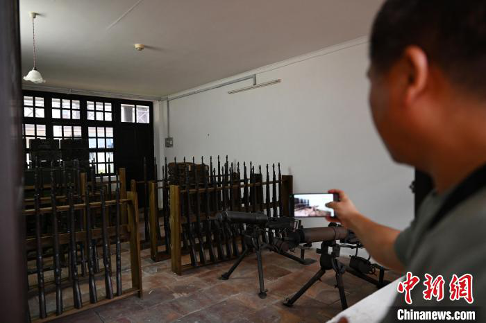 6月16日,廣州市黃埔區,黃埔軍校舊址紀念館重新開館。其中,全新策劃布展的“國共合作的不朽豐碑——大革命中的黃埔軍校(1924-1927)”校史展,通過300余張歷史圖片,以“歷史實物+多媒體還原”的形式,呈現了國共合作時期的黃埔軍校歷史,展出170件套展品,除館藏的82件套外,其余均為來自全國20個單位、黃埔后人及藏家的藏品?!包S埔同學錄查詢室”數據庫正式上線,現已收錄的黃埔軍校學員資料超過17萬人,支持以姓名、籍貫等各種方式模糊查詢。圖為黃埔軍校舊址紀念館的軍械庫吸引參觀者。中新社記者 陳楚紅 攝