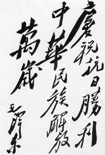 1945年9月,毛澤東為重慶《新華日報》的題詞:“慶祝抗日勝利,中華民族解放萬歲。”