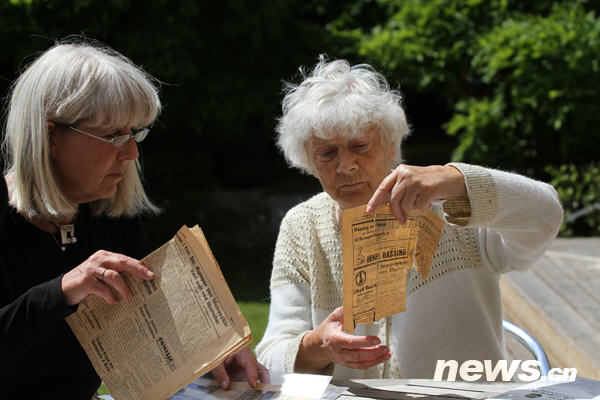 6月26日,在丹麥第二大城市奧胡斯郊區的一棟海濱別墅里,抗戰期間在南京救助和保護了近2萬名中國難民的丹麥友人貝恩哈爾·辛德貝格的妹妹比滕·安諾生(右)和外甥女瑪麗安娜·安諾生向記者展示有關南京大屠殺的史料。新華社發(林淼攝) 新華網丹麥奧胡斯7月6日電 通訊:芬芳的黃玫瑰——南京大屠殺見證人辛德貝格家人的往事追憶 新華社記者楊敬忠 報道員鮑越