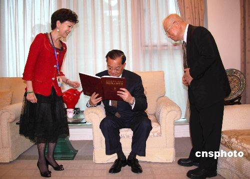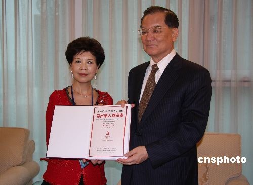 圖為胡葆琳團(tuán)長(左)向連戰(zhàn)(右)贈送紀(jì)念品《杰出華人與京奧》